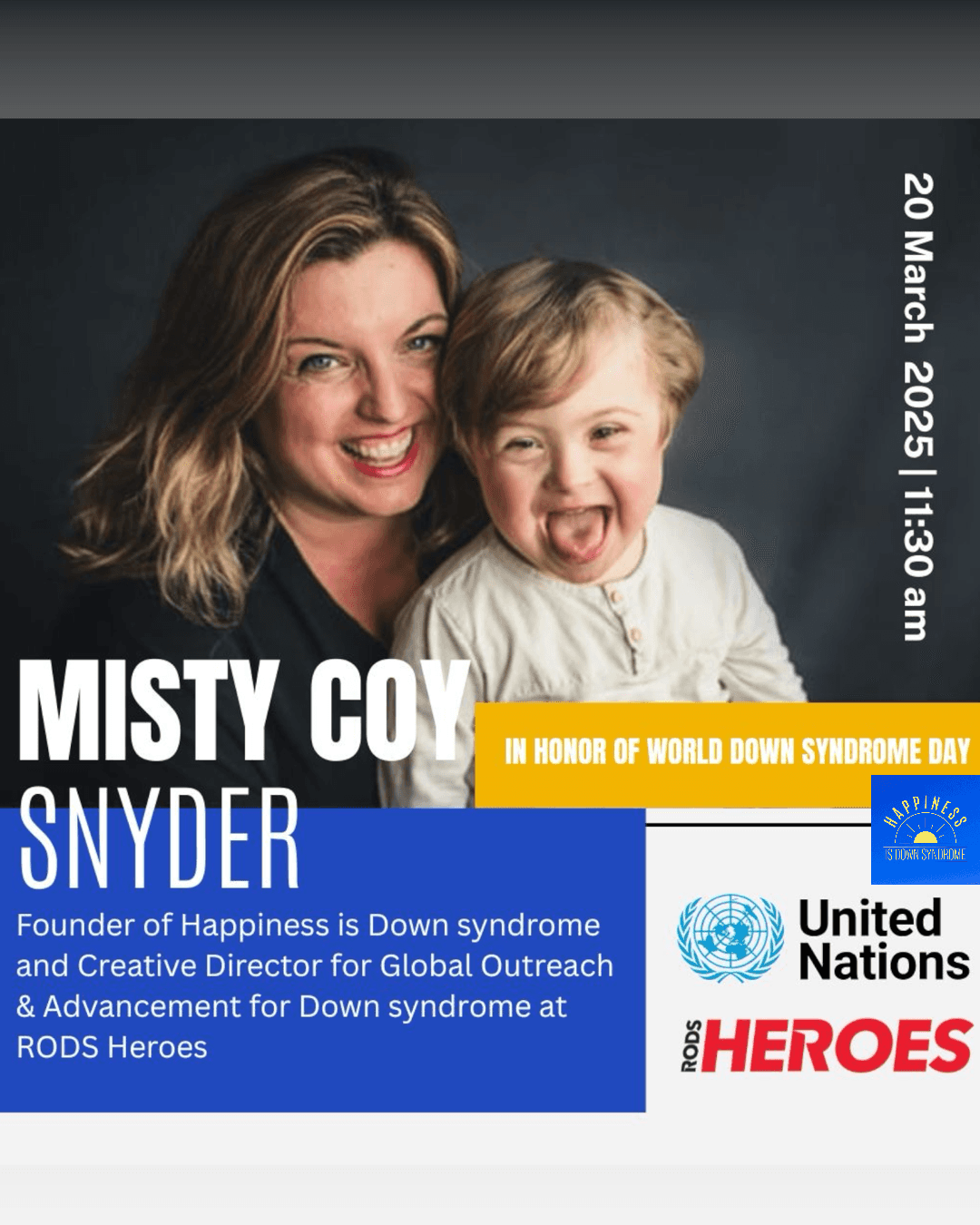 In addition to creating content for this platform, she launched her podcast Bold Voices, Soft Hearts, featuring stories of those who have discovered their passion through pain. For World Down Syndrome Day in March 2025, Misty spoke on a panel at the United Nations discussing community support for the Down syndrome community and frequently travels globally sharing her story of hope.